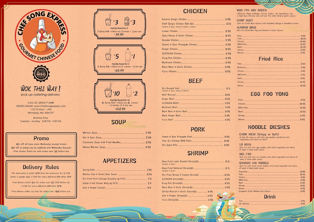 No matter what you choose, you can expect vibrant flavors crafted from fresh ingredients. Whether you’re sharing a meal with friends or enjoying a quiet dinner at home, Chef Song's Chinese Restaurant ensures every dish is made with a love for authentic cooking that shines through with every bite. So why not make your next meal a memorable one at Chef Song's? Experience the warmth of their hospitality paired with the taste of China right here in Winnipeg.